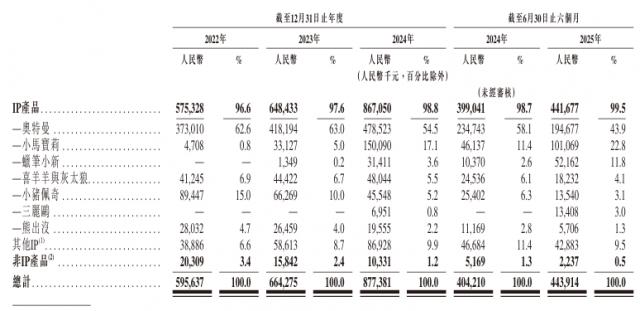 值得注意的是,奧特曼系列是金添動漫長期的營收支柱。2022 - 2024年,該IP產(chǎn)品收入從3.73億元增至4.79億元,但占總收入比重呈下降趨勢,從62.6%降至54.5%,2025年上半年進(jìn)一步降至43.9%。