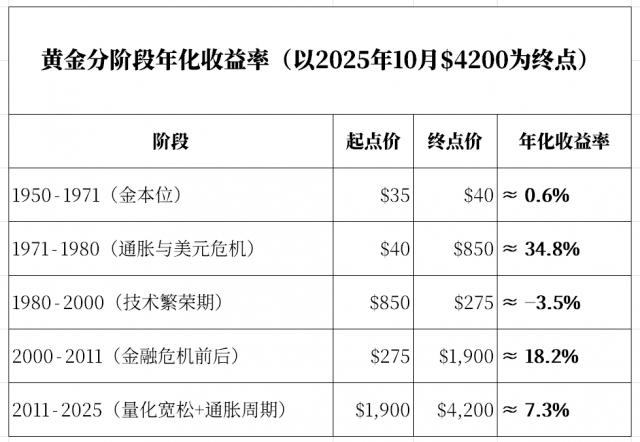 自1950年布雷頓森林體系建立,規(guī)定1盎司黃金價格為35美金,到如今漲至4200美金,75年間漲幅高達(dá)120倍。