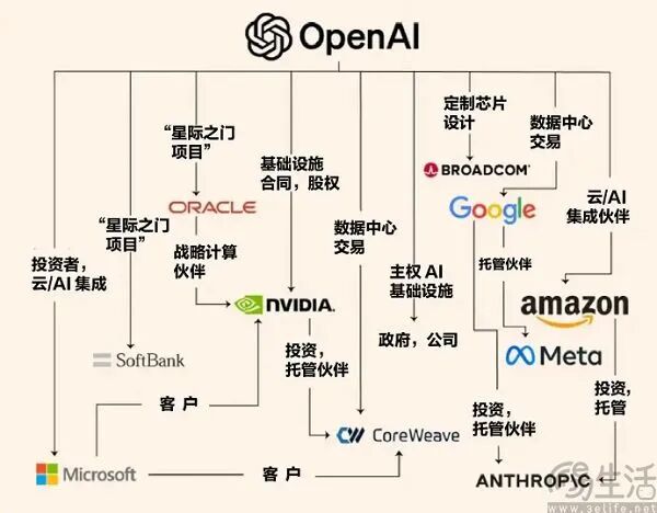 OpenAI急切尋求增長,根源在于“循環(huán)融資”。截至目前,它已與英偉達(dá)、AMD、甲骨文、軟銀等巨頭達(dá)成超1萬億美元的基礎(chǔ)設(shè)施和芯片協(xié)議。然而,大廠間的合作被市場(chǎng)視為資本游戲,供應(yīng)商向客戶投資、客戶再購買產(chǎn)品,如同空中樓閣。