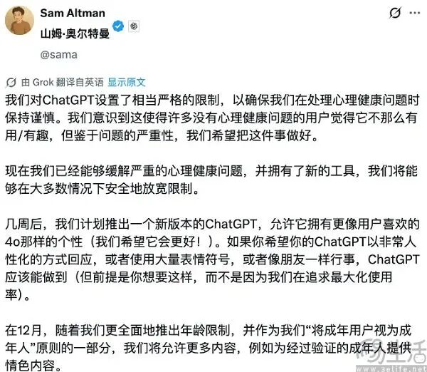 不過,OpenAI進(jìn)行用戶分層不只是為了保護(hù)未成年人,他們還有更大的野心。日前,山姆·奧特曼在社交平臺(tái)明確表示,將放松對(duì)ChatGPT的內(nèi)容管制,還透露“為經(jīng)過驗(yàn)證的成年用戶解禁情色內(nèi)容”。他稱“把成年人當(dāng)成年人對(duì)待”,還為這項(xiàng)新政策辯護(hù),說“我們不是世界道德警察”。