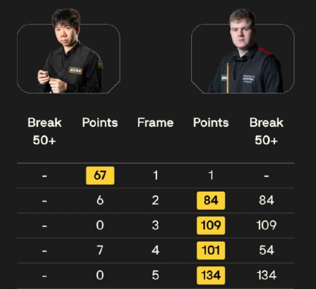 然而從第二局起,雷佩凡狀態(tài)低迷,而亞倫 - 希爾則勢(shì)不可擋。第二局,亞倫 - 希爾單桿打出84分,以84 - 6的大比分拿下勝利。隨后三局,亞倫 - 希爾更是火力全開,分別單桿打出109分、54分、134分,讓雷佩凡毫無(wú)還手之力。