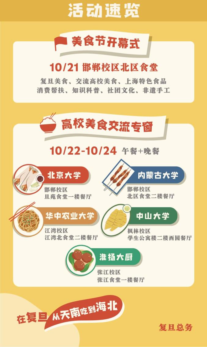 明起(10月22日)至24日,周三到周五狂歡繼續(xù)。北大、中大、華農(nóng)、內(nèi)大加上淮揚(yáng)名廚,五路“廚神”集結(jié)復(fù)旦,帶來地道煙火味!