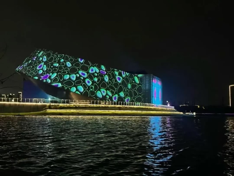據(jù)澎湃新聞了解,本次雙年展的舉辦地——余杭美術館全新啟幕。該美術館位于杭州良渚新城玉湖綜合體南側(cè)水域的小島上,建筑面積達6160平方米,于2024年竣工。其館身以雙環(huán)同構(gòu)的圓璧之形,營造出“懸浮”于天地之間的獨特意象。館體外立面采用玉石玻璃和鋁板創(chuàng)新結(jié)合的方式,在夜晚會呈現(xiàn)360°動態(tài)投影。
