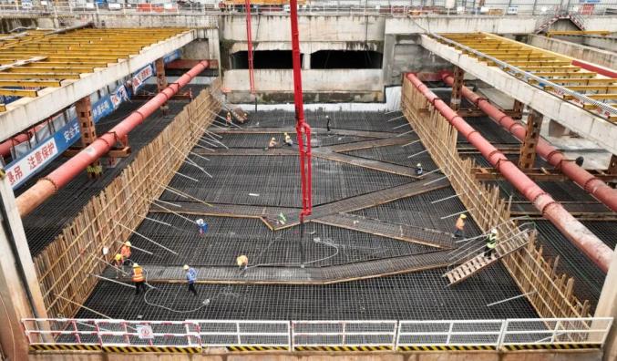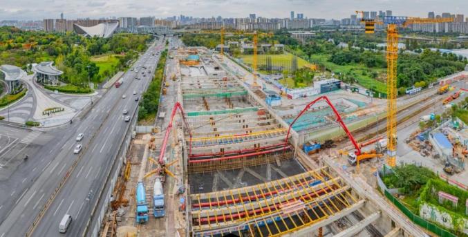 鳳凰山站(鳳臺(tái)三路站)正在進(jìn)行最后一塊頂板澆筑。本次實(shí)現(xiàn)主體結(jié)構(gòu)封頂?shù)镍P凰山站(鳳臺(tái)三路站)位于成都市金牛區(qū),北星大道與熊貓大道交叉口,緊鄰鳳凰山公園與成都露天音樂(lè)公園。車(chē)站全長(zhǎng)988.2米、寬52米,基坑深度達(dá)37.3米,是成德線全線最長(zhǎng)的車(chē)站。