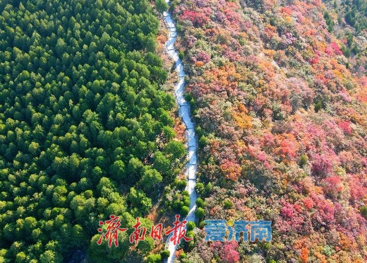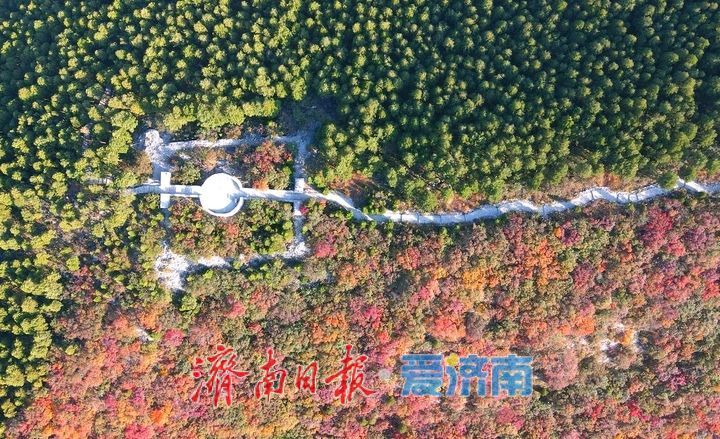 據(jù)悉,蝎子山南面山體種有數(shù)千棵黃櫨樹。每年霜降節(jié)氣前后,低溫會使黃櫨樹樹葉由綠變紅,漫山紅遍,景色迷人。從高空借助無人機(jī)俯瞰,蝎子山兩種顏色界限清晰,如刀切一般,景色十分壯觀。(濟(jì)南日報愛濟(jì)南記者:崔?。?/p>