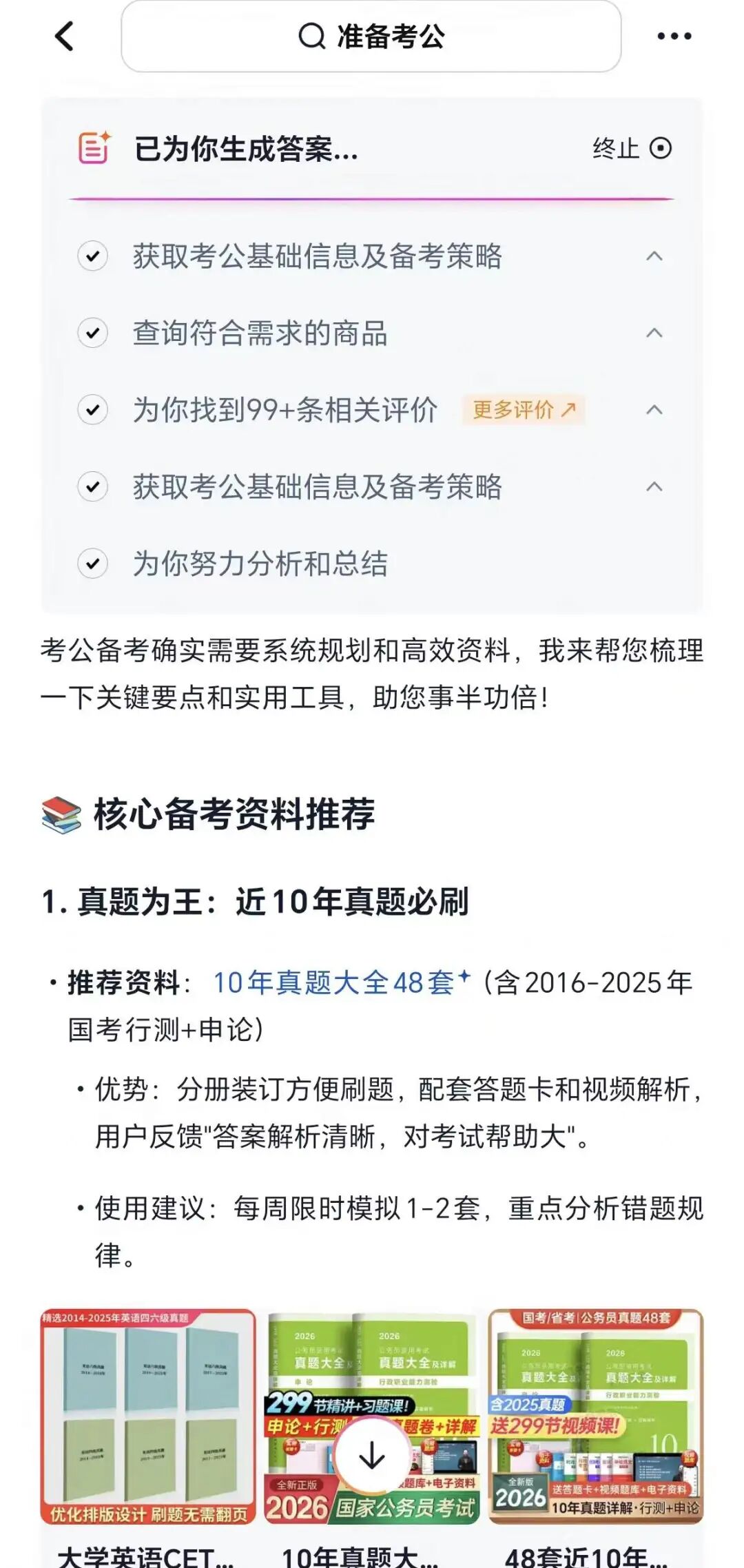 在消費(fèi)者側(cè),AI購(gòu)物工具的使用頻率顯著提高。用戶無(wú)需搜索具體品牌,只需輸入「想提高數(shù)學(xué)成績(jī)」或「準(zhǔn)備考公」,系統(tǒng)就能生成學(xué)習(xí)方案,并推薦對(duì)應(yīng)的硬件和課程。教育產(chǎn)品因此進(jìn)入自然推薦路徑,不再依賴用戶主動(dòng)查找,而是通過(guò)AI識(shí)別需求后直接呈現(xiàn)。