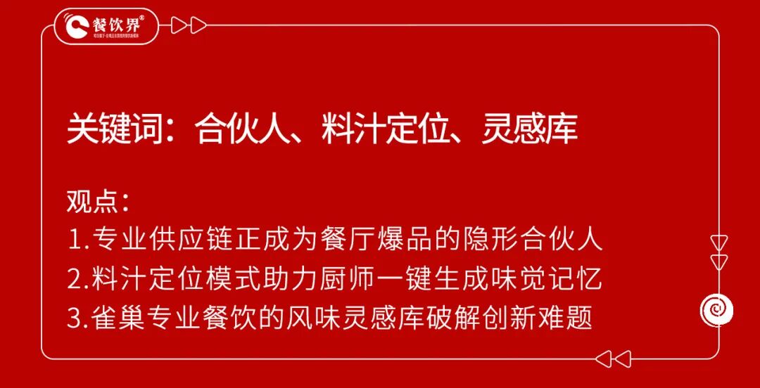 供應鏈成了餐廳的“靈感伙伴”,打造旺店旺菜從餐廳單打獨斗變成和供應鏈協(xié)同作戰(zhàn)。專業(yè)供應鏈能守護招牌菜、加速引流菜創(chuàng)新,提升產(chǎn)品力。