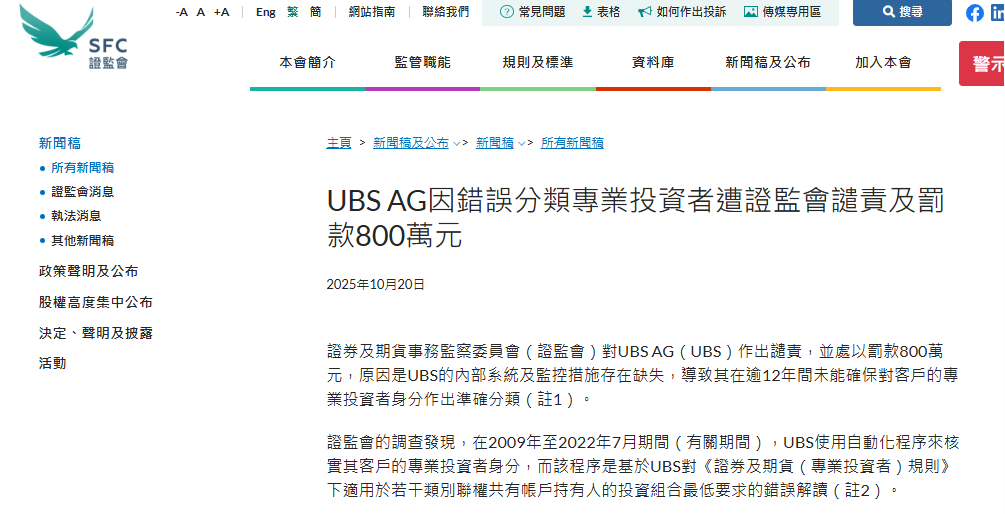 瑞銀因錯(cuò)誤分類專業(yè)投資者遭香港證監(jiān)會譴責(zé)并罰款800萬