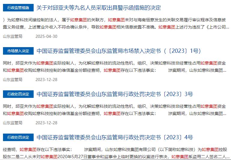 如意集團“這一劫”早有預(yù)兆,2023年到2025年,如意集團因為財務(wù)造假、關(guān)聯(lián)交易等問題,多次被山東證監(jiān)會采取責(zé)令改正、出具警示函的監(jiān)管措施。比如,如意集團2022年到2023年年報中對一項長期股權(quán)投資減值計提不充分,另外2021年至2022年對相關(guān)關(guān)聯(lián)交易也未按照規(guī)定履行審議程序和信披義務(wù)。