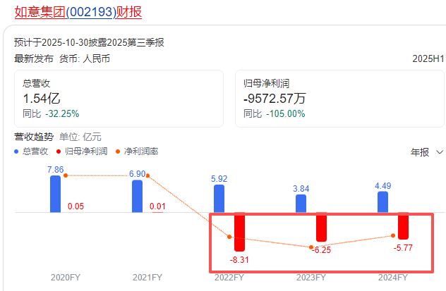 2020年之后,如意集團的財務(wù)問題就愈演愈烈。2022年到2025上半年,累計虧損了21億元。2024年營收才4.49億,卻虧損了5.77億。今年上半年,實現(xiàn)營業(yè)收入1.54億元,較去年同期的2.28億元大幅下滑32.25%,歸母凈利潤虧損9572.57萬元,與上年同期虧損額擴大105%。