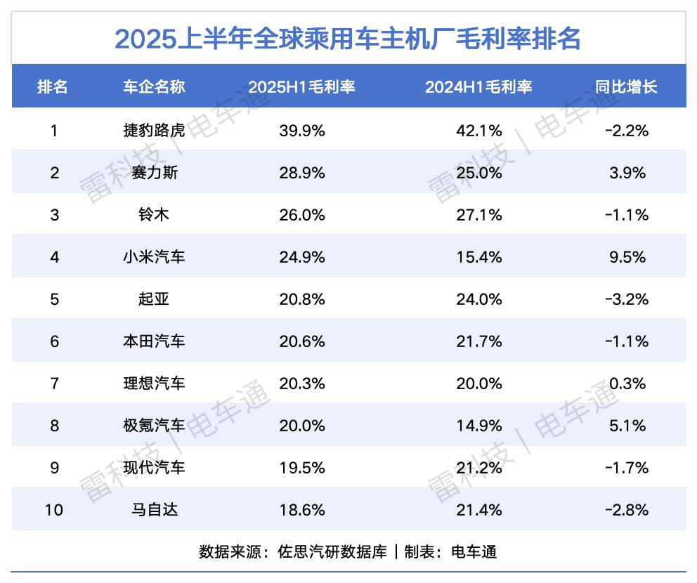 日前,“佐思汽研”公布了今年上半年全球乘用車主機(jī)廠毛利率排行榜,捷豹路虎以39.9%的毛利率一馬當(dāng)先,賽力斯和小米汽車分別以28.9%和24.9%的毛利率位居第二和第四,理想、極氪也進(jìn)入毛利率排名前十,超越了豐田、梅賽德斯 - 奔馳、大眾集團(tuán)等傳統(tǒng)知名大廠。