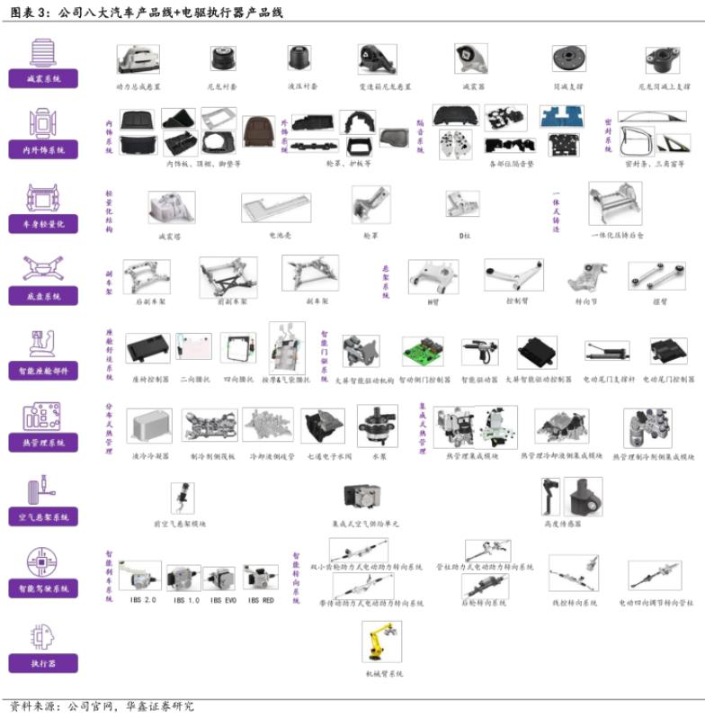 上市之后,拓普集團(tuán)精準(zhǔn)地抓住了國(guó)內(nèi)汽車(chē)產(chǎn)業(yè)電動(dòng)化轉(zhuǎn)型的風(fēng)口,并將公司產(chǎn)品線從減震、內(nèi)飾延伸到輕量化底盤(pán)、熱管理、智能駕駛等領(lǐng)域,合作客戶包括特斯拉、華為-賽力斯、小米、吉利、比亞迪、奇瑞、理想、蔚來(lái)、長(zhǎng)城、小鵬等知名車(chē)企。截至目前,拓普集團(tuán)主營(yíng)業(yè)務(wù)已經(jīng)涵蓋NVH減震、內(nèi)外飾、熱管理、底盤(pán)系統(tǒng)等八大系列產(chǎn)品,屬于國(guó)內(nèi)汽車(chē)零部件領(lǐng)域品類(lèi)最豐富的企業(yè)之一。