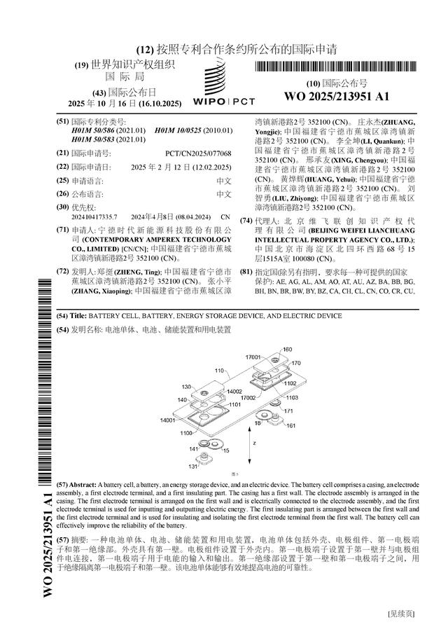 寧德時(shí)代公布“電池單體、電池、儲(chǔ)能裝置和用電裝置”國(guó)際專利申請(qǐng)