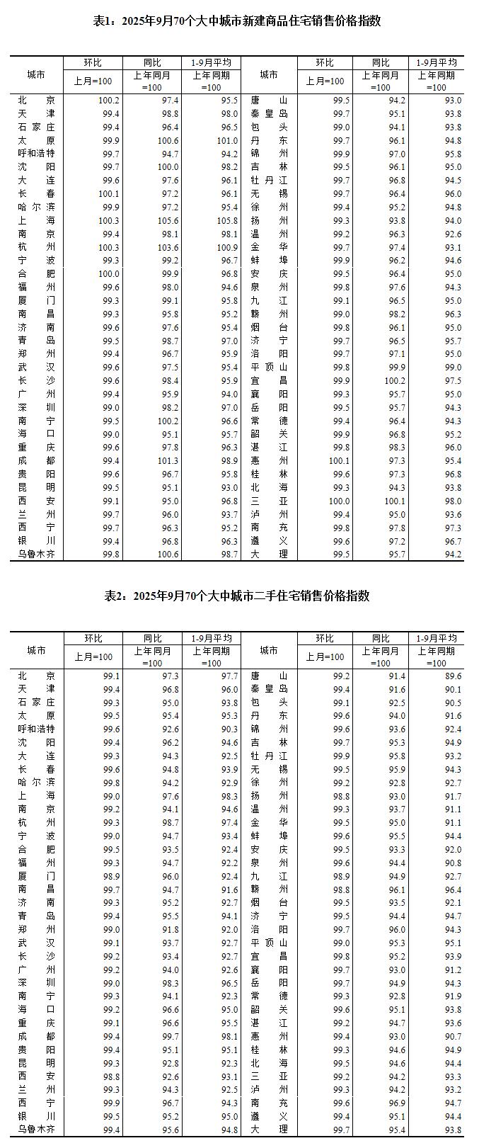 國家統(tǒng)計局20日公布的數(shù)據(jù)顯示,2025年9月份,70個大中城市中,各線城市商品住宅銷售價格環(huán)比下降,同比降幅繼續(xù)呈收窄態(tài)勢。