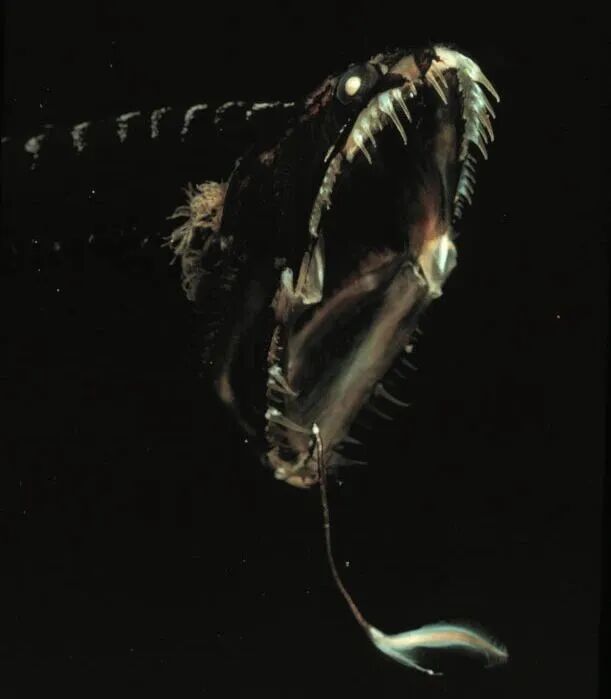 此外,為了提高捕食效率,深海捕食者們也有辦法。像穴口奇棘魚有夸張的尖牙和大嘴;寬咽魚長(zhǎng)著大嘴和喉囊,能吞下大獵物。