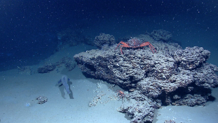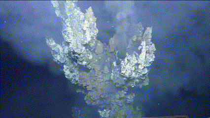 1977年,美國(guó)“阿爾文號(hào)”潛水器在2500米深的海底裂谷,拍到“黑煙囪”往外噴滾燙黑煙的畫面,“煙囪”邊上還擠滿了管狀蠕蟲、巨型貝殼和蝦蟹。