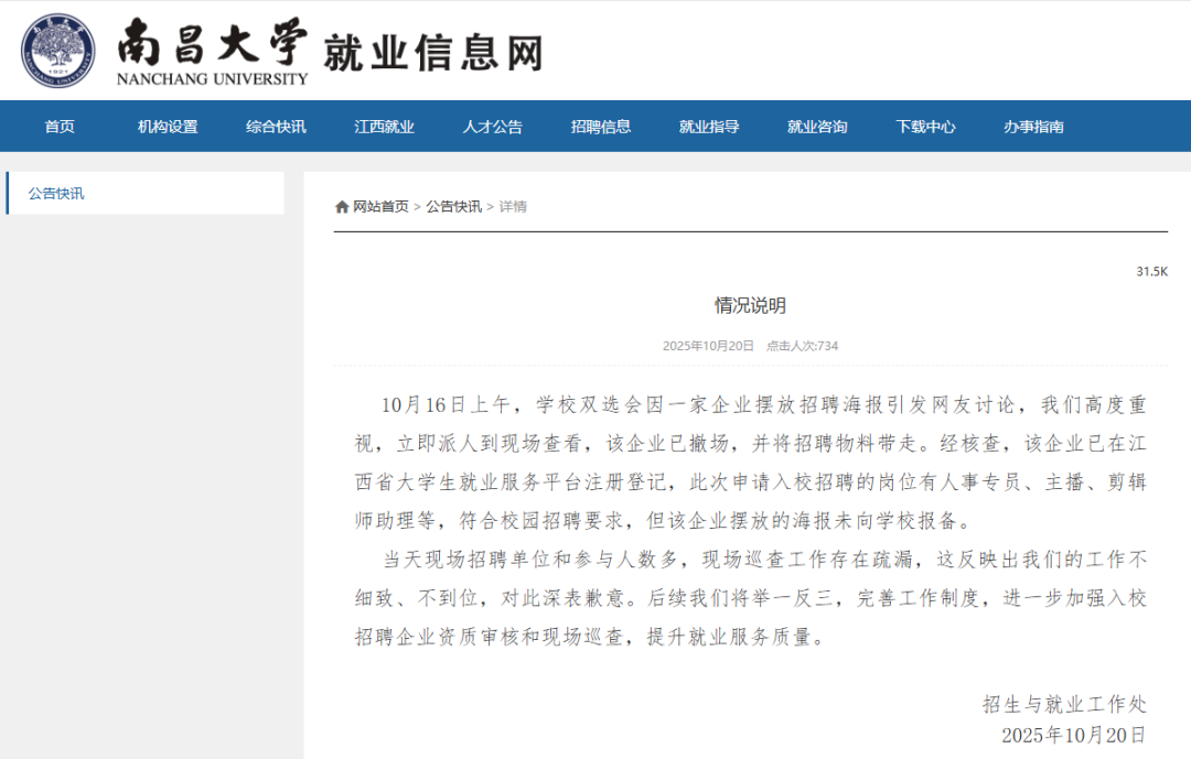 10月20日,南昌大學(xué)招生與就業(yè)工作處發(fā)布《情況說(shuō)明》,就“招聘現(xiàn)場(chǎng)現(xiàn)露骨女主播招聘海報(bào)”一事作出回應(yīng)。全文內(nèi)容如下: