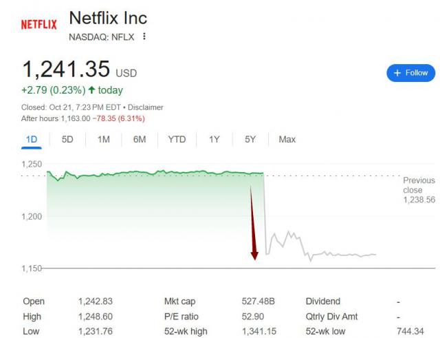 財報公布后,小幅收漲逾 0.2% 的奈飛股價在盤后出現(xiàn)跳水,盤后跌幅一度達到 7.5%。奈飛股價曾在 6 月 30 日收創(chuàng)歷史新高,逼近 1340 美元,此后便震蕩下行,7 月下旬公布的二季度財報也未能提振股價,到本周二收盤時,已較收盤紀錄高位跌去 7% 以上。