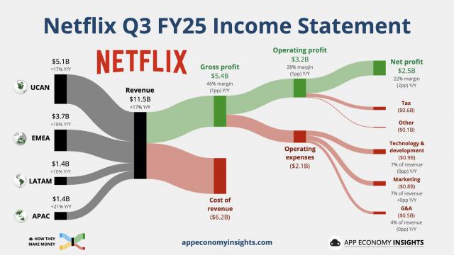 凈利潤:三季度凈利潤 25.47 億美元,同比增長 7.7%,分析師預(yù)期約 30 億美元,奈飛自身指引 29.79 億美元,二季度同比增長近 45.6%。