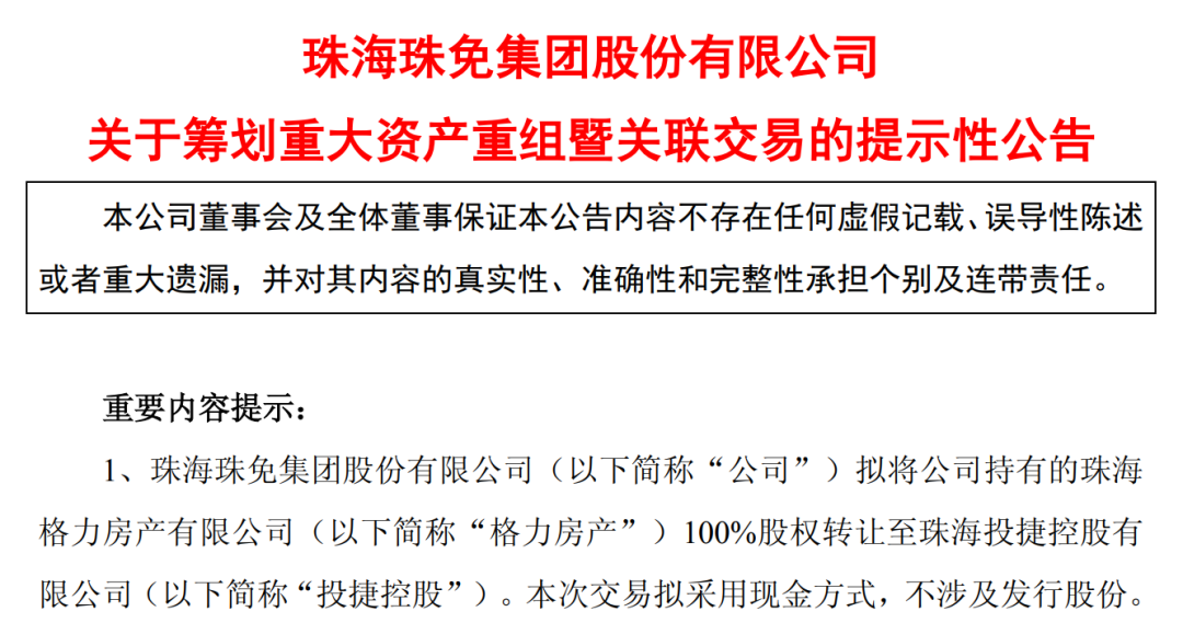 根據(jù)公告,珠免集團(tuán)打算把持有的珠海格力房產(chǎn)有限公司(簡稱格力房產(chǎn))100%股權(quán),轉(zhuǎn)讓給珠海投捷控股有限公司(簡稱投捷控股)。此次交易采用現(xiàn)金方式,不涉及發(fā)行股份。該交易預(yù)計(jì)構(gòu)成《上市公司重大資產(chǎn)重組管理辦法》規(guī)定的重大資產(chǎn)重組,但不會(huì)使公司控股股東和實(shí)際控制人發(fā)生變化。