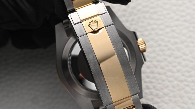 表殼直徑 41 毫米,采用勞力士經(jīng)典的蠔式鋼材質(zhì)。這是勞力士特制的不銹鋼,堅固耐磨且光澤度高。外圈點綴 18ct 黃金,與鋼材形成鮮明對比。黃金不僅用于外圈,還延伸到表冠、鏈節(jié)中央,形成“間金”設計。這種搭配讓腕表既有潛水表的運動感,又增添了金屬的尊貴質(zhì)感。