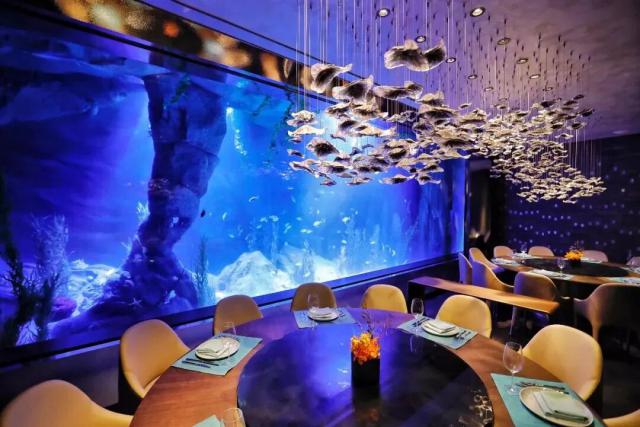 晚餐在酒店的‘漁火’特色餐廳。餐廳在水面以下,被10米深的水族館環(huán)繞,70多種海洋生物在身邊游,仿佛置身海底世界,氛圍感十足。