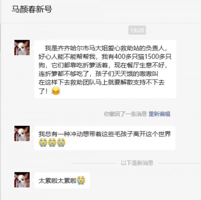 我是齊齊哈爾救助基地的負(fù)責(zé)人馬彥春,好心人們,能否幫幫我?我這里有400多只貓和1500多只狗,它們一直靠吃折籮維持生計(jì)。如今餐廳生意不佳,折籮都不夠吃了,孩子們餓得直叫喚。