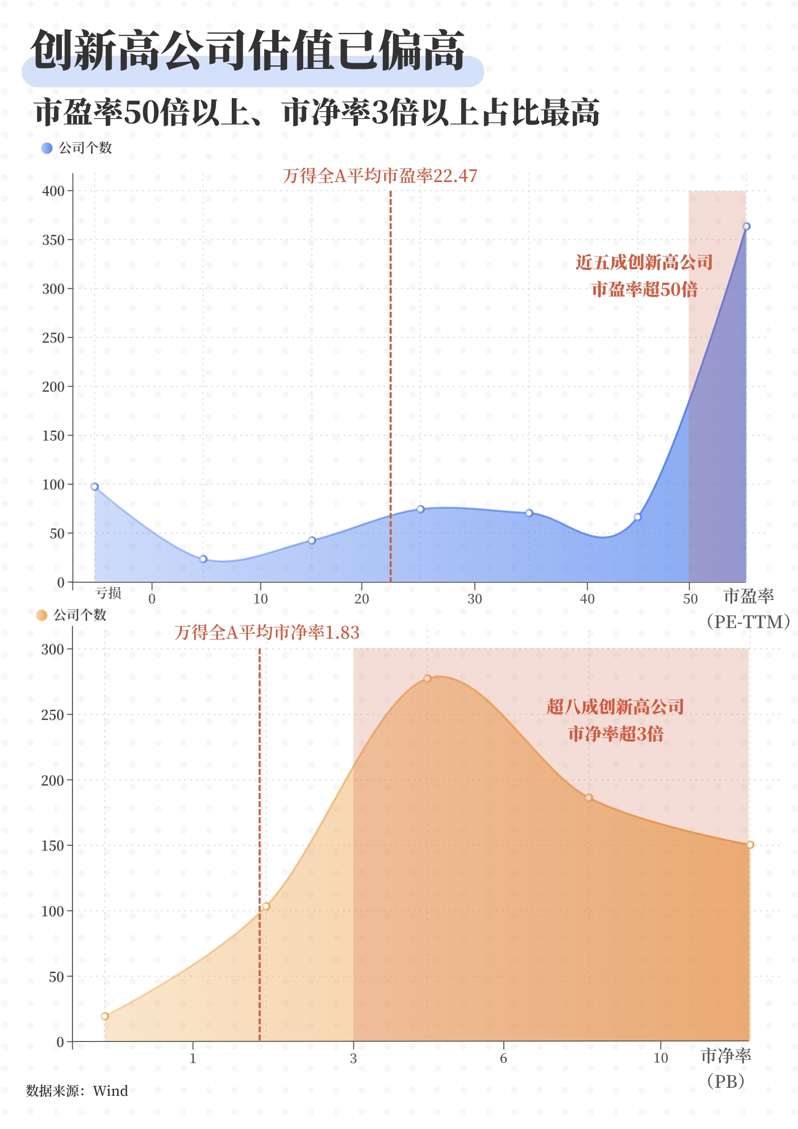 735家創(chuàng)新高公司中,市盈率超過50倍的公司達(dá)到363家,市凈率超過3倍的公司達(dá)到613家,呈現(xiàn)出明顯的高估值特征。