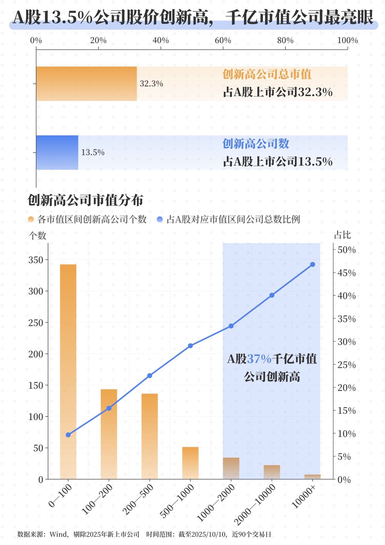 這735家公司僅占A股總數(shù)的13.5%,卻貢獻(xiàn)了32.3%的總市值。其中,千億市值公司里,有36.6%(63/172)在此期間創(chuàng)下新高,而百億市值以下公司中,該比例僅為9.6%(342/3550),市場風(fēng)格高度集中于龍頭企業(yè)。
