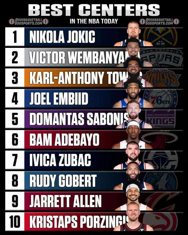 中鋒前十依次為:1約基奇、2文班、3唐斯、4恩比德、5小薩、6阿德巴約、7祖巴茨、8戈貝爾、9賈勒特阿倫、10波爾津吉斯。約基奇排在第一理所當(dāng)然,他是現(xiàn)役聯(lián)盟第一人,個(gè)人能力和帶隊(duì)能力都很強(qiáng),長期在他身邊打球的球員都能拿到上億薪資,可見其實(shí)力之強(qiáng)。文班現(xiàn)在排第二或許有待商榷,雖實(shí)力不俗,但似乎還沒達(dá)到這個(gè)高度。