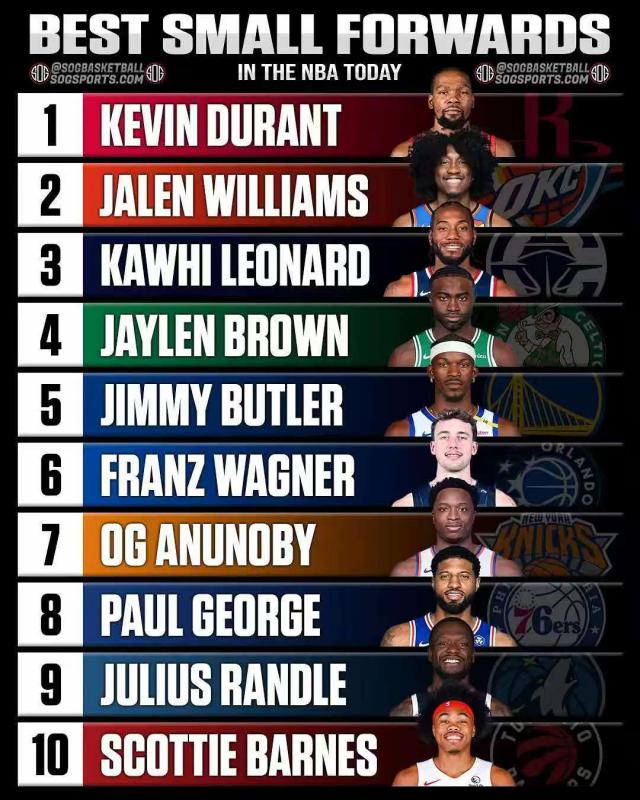 小前鋒前十依次為:1杜蘭特、2杰威、3倫納德、4布朗、5巴特勒、6小瓦格納、7阿奴諾比、8喬治、9蘭德爾、10巴恩斯。杜蘭特雖處于生涯末年,但仍是聯(lián)盟最好的單打手,火箭得到他堪稱絕配。杰威是現(xiàn)役攻防一體出色的二當(dāng)家,處理球能力也不錯(cuò),若讓他帶隊(duì)也能勝任。