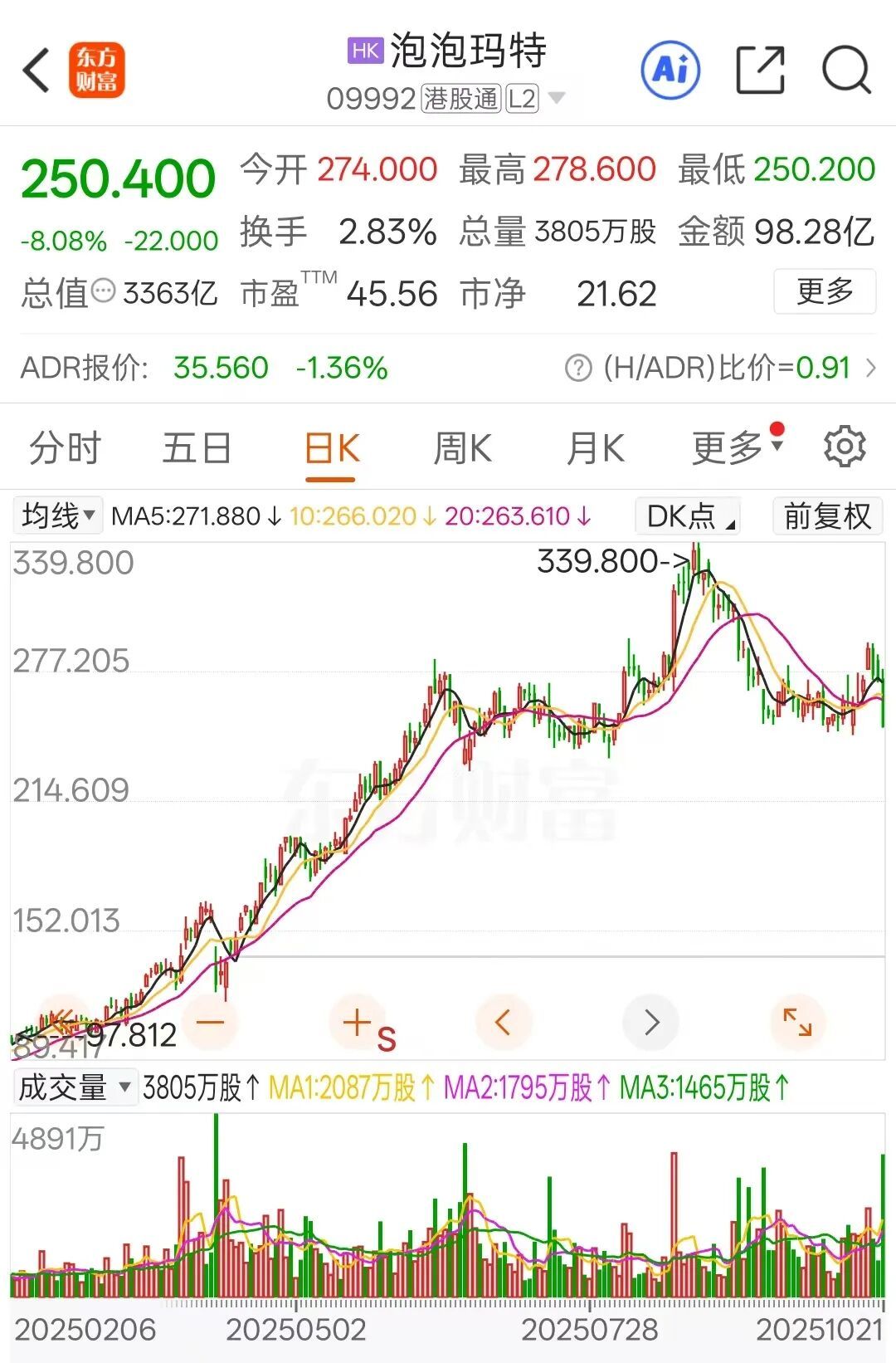 不過(guò),周二泡泡瑪特港股大跌8.08%,創(chuàng)下自4月初以來(lái)的最大單日跌幅。截至10月21日收盤,泡泡瑪特報(bào)250.4港元/股,總市值超3300億港元。