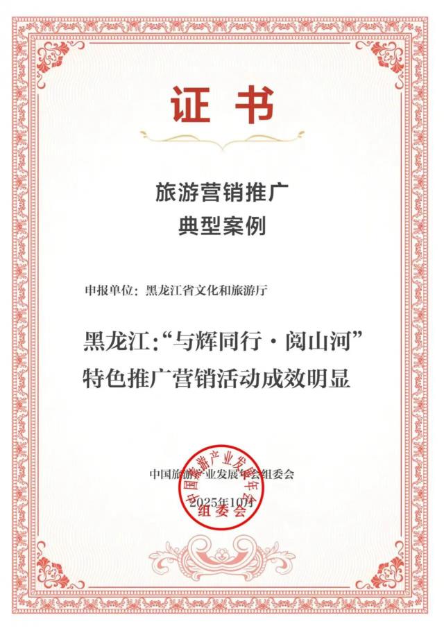 近日,在遼寧省沈陽(yáng)市舉辦了由文化和旅游部產(chǎn)業(yè)發(fā)展司指導(dǎo)、中國(guó)旅游報(bào)社主辦的第十二屆中國(guó)旅游產(chǎn)業(yè)發(fā)展年會(huì)。“黑龍江:‘與輝同行 · 閱山河’特色推廣營(yíng)銷活動(dòng)成效顯著”,成功入選2025中國(guó)旅游產(chǎn)業(yè)影響力案例——旅游營(yíng)銷推廣典型案例。