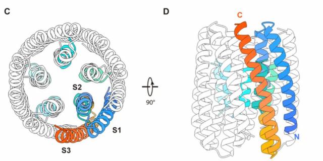 圖1. 從頭設(shè)計(jì)15根α螺旋的五聚體跨膜蛋白