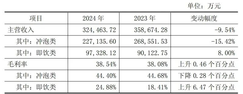 圖:香飄飄2024年度主營(yíng)收入及毛利率情況