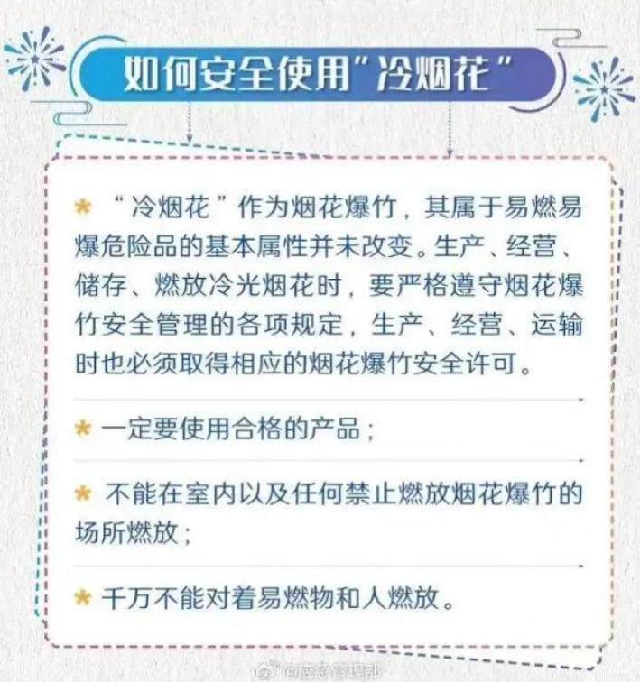 “冷煙花”也是煙花,具有易燃易爆危險品的基本屬性,燃放時溫度極高,噴射口溫度可達800℃,這一高溫可能會灼傷你。