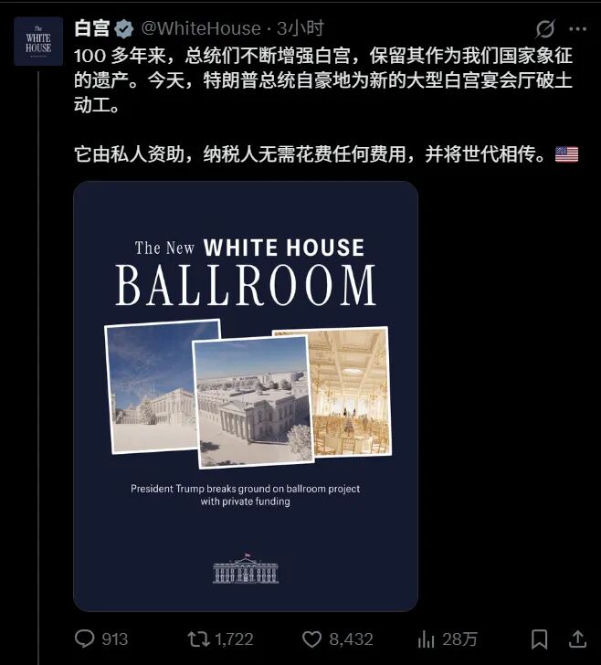 “150多年來,每一位總統(tǒng)都夢想在白宮擁有一個(gè)宴會廳,用于舉辦盛大聚會、國事訪問等活動。我很榮幸能成為首位最終啟動這一重要項(xiàng)目的總統(tǒng)?!碧乩势?0日晚間在社交平臺寫道。