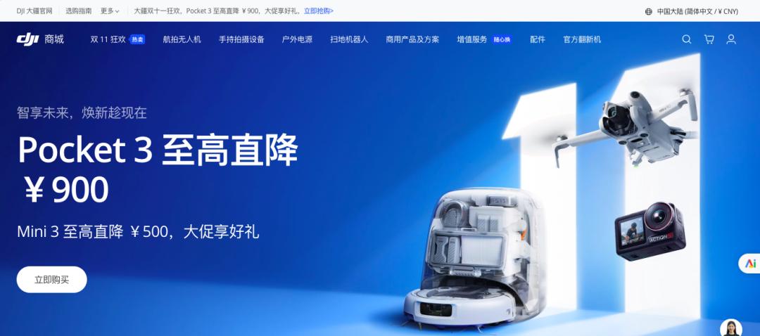 10月9日,國慶長(zhǎng)假結(jié)束后的首個(gè)工作日,大疆為“雙11”大促拉開帷幕。此次大促涉及運(yùn)動(dòng)相機(jī)、全景相機(jī)、入門航拍機(jī)等多款拍攝產(chǎn)品大幅降價(jià),就連8月剛發(fā)布的掃地機(jī)器人和7月上市的全景相機(jī)也在降價(jià)之列。