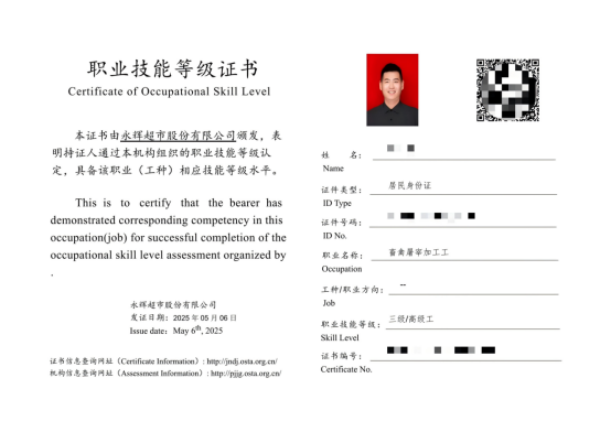 值得一提的是,永輝超市的“工匠計劃”此前已獲得國家級權(quán)威認(rèn)證支持。作為“福州市商貿(mào)流通行業(yè)工匠學(xué)院”建設(shè)主體,永輝于2024年正式取得職業(yè)技能等級認(rèn)定資質(zhì)。在3 - 6月的認(rèn)定窗口期內(nèi),有53名員工通過系統(tǒng)性理論及實操考核,成功獲得國家人社部認(rèn)可的“職業(yè)技能等級證書”。該證書已納入全國聯(lián)網(wǎng)查詢系統(tǒng),與國家職業(yè)資格證具有同等效力,大大提高了員工技能的“含金量”與市場競爭力。