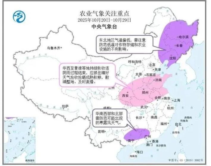 10月20日至29日,東北地區(qū)、內(nèi)蒙古大部、新疆以晴天為主,但部分地區(qū)平均氣溫偏低4℃至6℃,且有霜凍,需防范低溫對(duì)作物存儲(chǔ)和農(nóng)業(yè)設(shè)施的不利影響。北方農(nóng)區(qū)應(yīng)抓住晴好天氣加快秋收,及時(shí)烘干入庫、通風(fēng)儲(chǔ)存,防止籽粒發(fā)芽霉變。