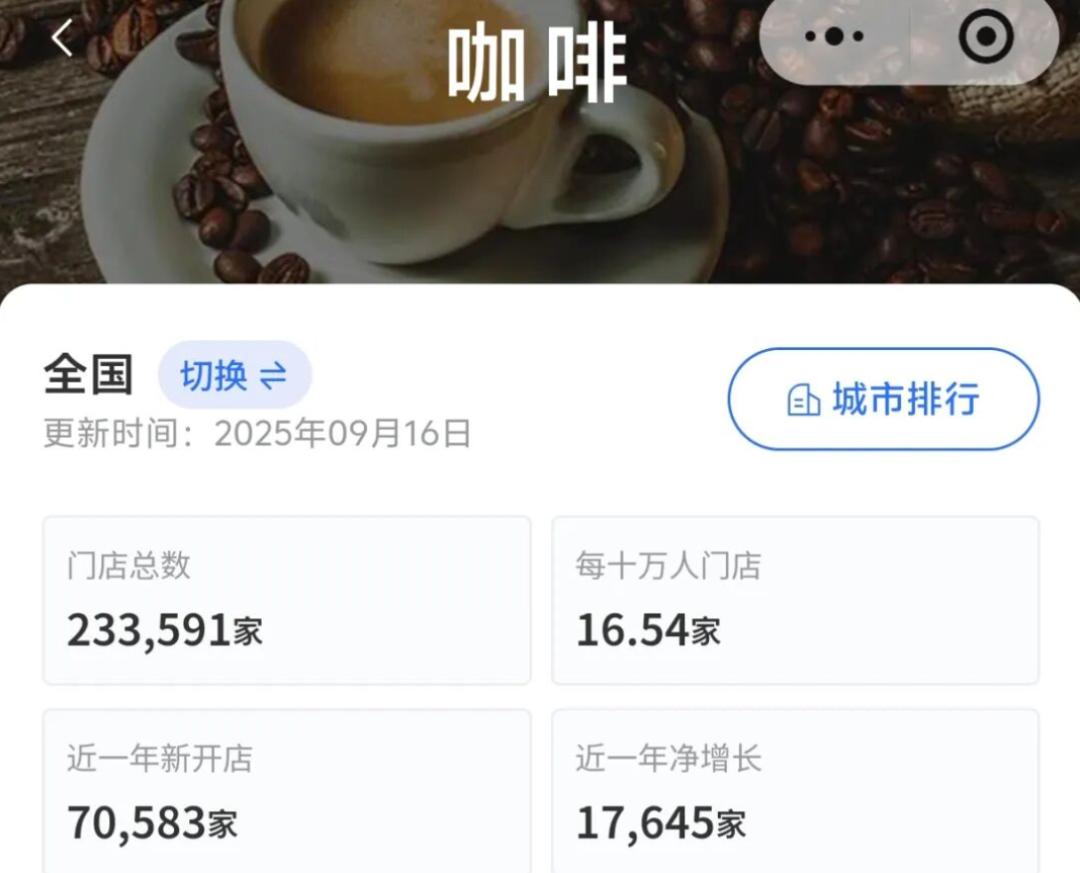 2020年底,中國咖啡館數(shù)量只有10.8萬家。截至今年9月16日,窄門餐眼數(shù)據(jù)顯示,國內(nèi)咖啡門店總數(shù)達到23.3萬 + 家。
