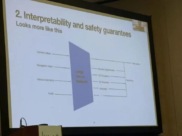 從模糊的圖像中可以看到,這頁P(yáng)PT的標(biāo)題是《可解釋性和安全性保證》,都是目前自動(dòng)駕駛的重要議題。