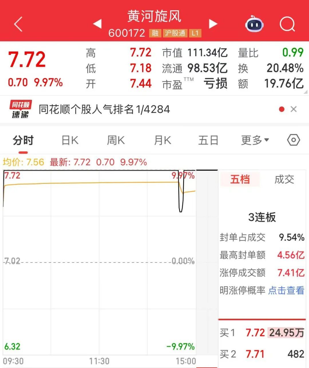 尾盤,深地經(jīng)濟(jì)概念股黃河旋風(fēng)漲停,收獲“三連板”,登上同花順熱股榜第一名。