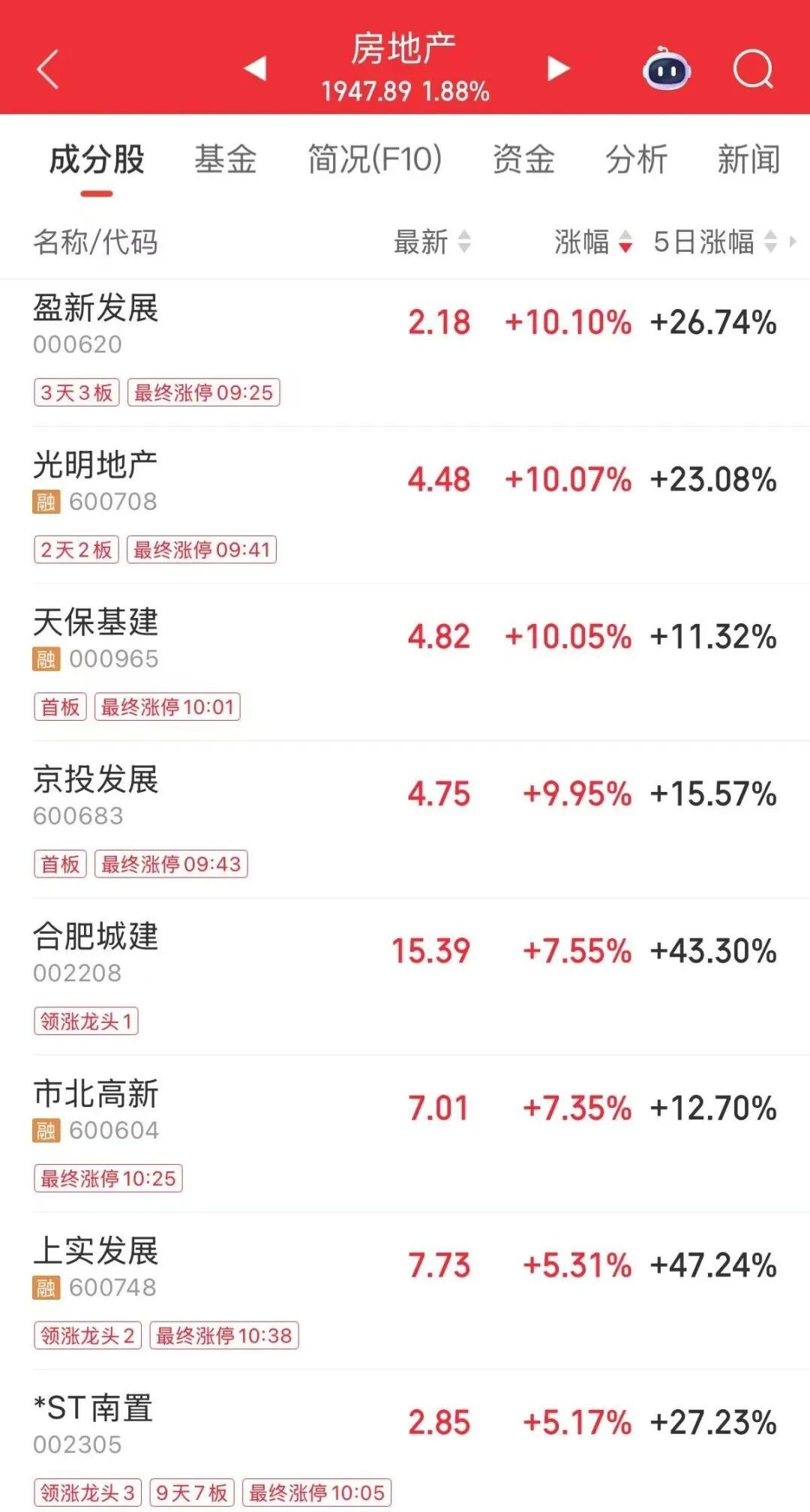 當(dāng)日,房地產(chǎn)板塊表現(xiàn)活躍。盈新發(fā)展實(shí)現(xiàn)“三連板”,光明地產(chǎn)、天保基建、京投發(fā)展等多股漲停。