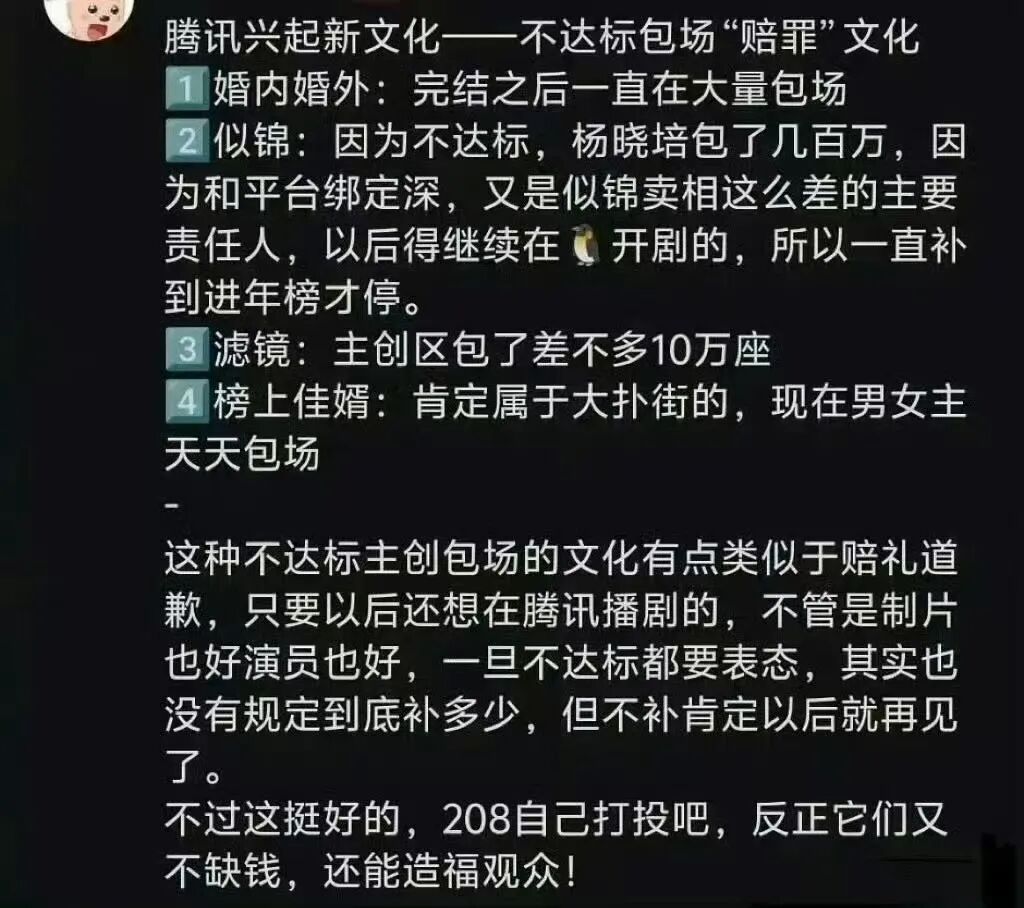 過去兩年“云包場”常見,劇集不火,主演自費(fèi)請觀眾看劇。看似“寵粉”,實(shí)則用錢彌補(bǔ)熱度不足。平臺投入大、回報(bào)低,演員要分擔(dān)熱度壓力。