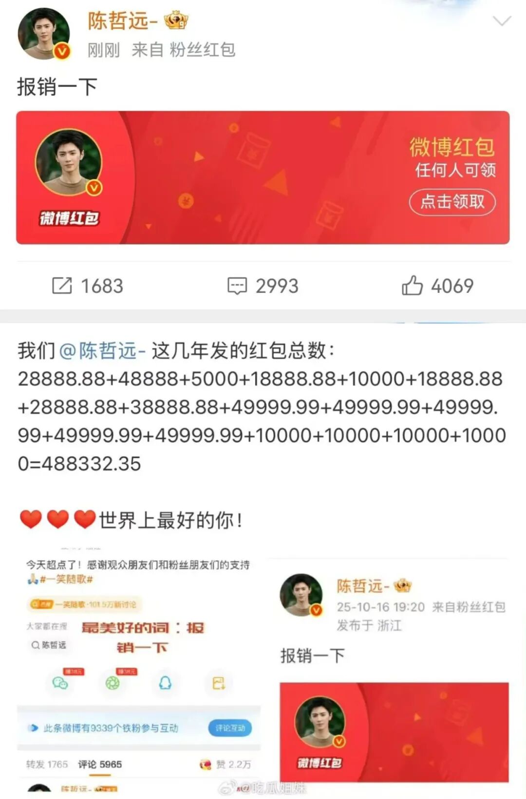 陳哲遠(yuǎn)是內(nèi)娛第一個(gè)發(fā)紅包的明星,從2023年起,累計(jì)發(fā)了約48.8萬元。有多次零散金額,如0.88元、0.99元等;2024年春節(jié)發(fā)了約14萬元;2025年1月28日(除夕)骨折住院還連發(fā)3個(gè)紅包,每個(gè)49999元,合計(jì)近15萬元。