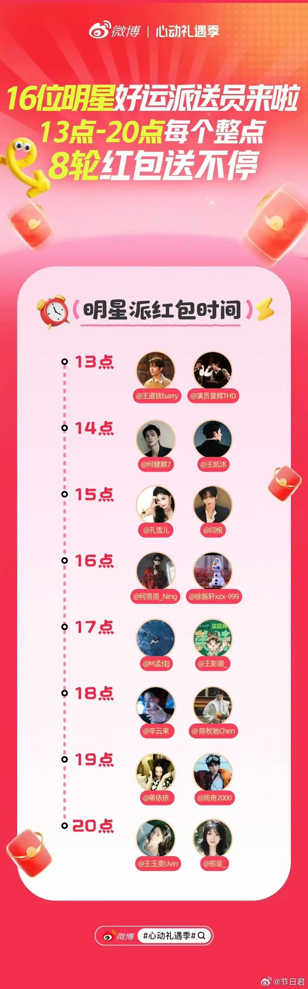 先是陳哲遠(yuǎn)為慶?!兑恍﹄S歌》熱度破9000,發(fā)了28888元紅包;接著徐振軒、王影璐、辛云來、蔣依依、王玉雯組團(tuán)參與 #心動禮遇季# 活動,每人發(fā)8888元。網(wǎng)友邊搶紅包邊調(diào)侃:“追劇、刷微博還能領(lǐng)錢,明星開始給觀眾送錢了?”(ps:微博是不是沒招了,讓明星發(fā)紅包)