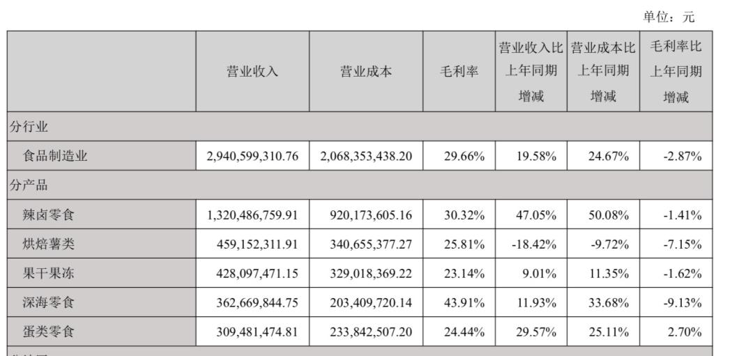 鹽津鋪?zhàn)影肽陥?bào)顯示,魔芋精粉采購(gòu)均價(jià)上漲超30%,毛利率從32.53%降至29.66%。衛(wèi)龍蔬菜制品毛利率也從52.52%降至46.5%。