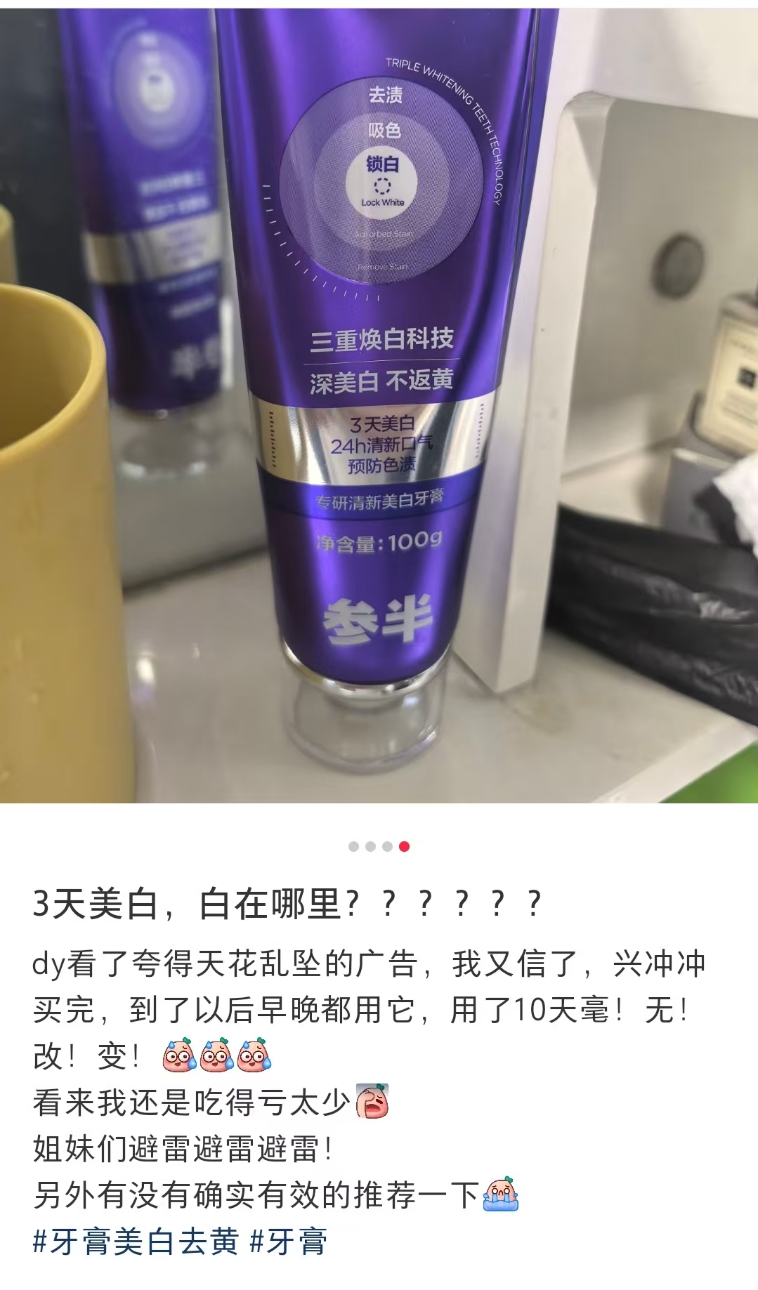有用戶在社交平臺直言,輕信廣告宣傳下單后,堅(jiān)持早晚使用10天,牙齒美白去漬效果“毫無改變”。