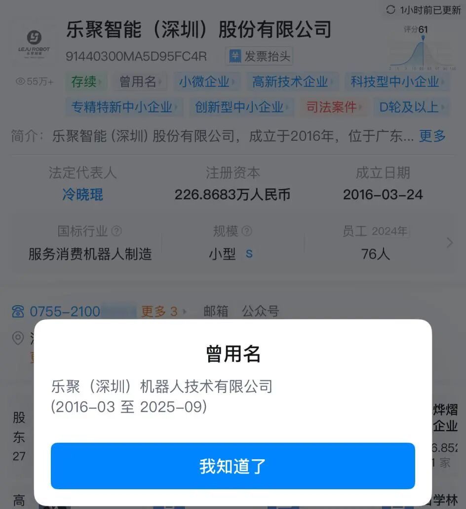 記者發(fā)現(xiàn),今年 9 月,樂(lè)聚機(jī)器人發(fā)生市場(chǎng)主體類型變更,從有限責(zé)任公司變?yōu)楣煞萦邢薰荆ǚ巧鲜?、自然人投資或控股),工商注冊(cè)名稱也從樂(lè)聚(深圳)機(jī)器人技術(shù)有限公司變更為樂(lè)聚智能(深圳)股份有限公司。